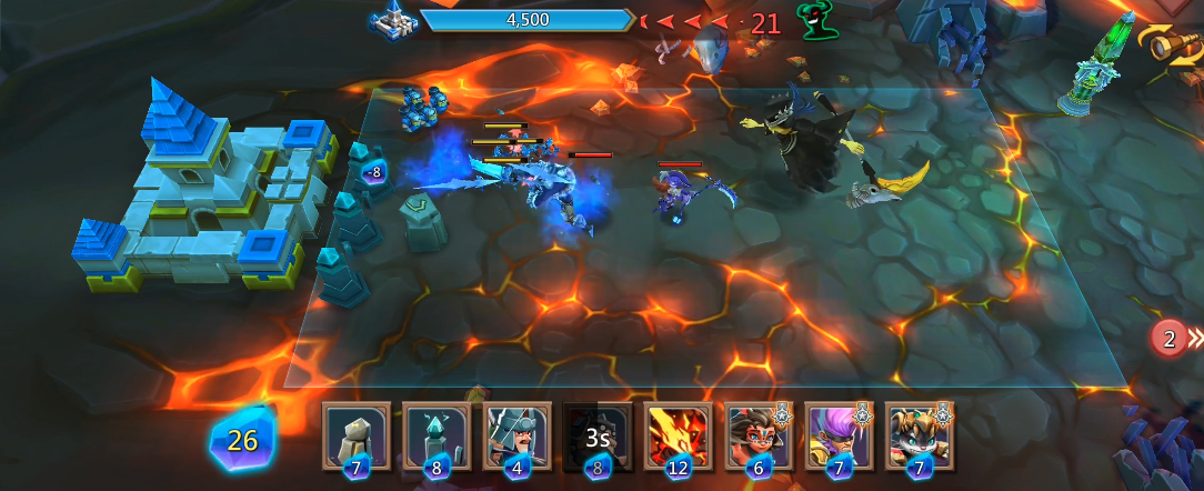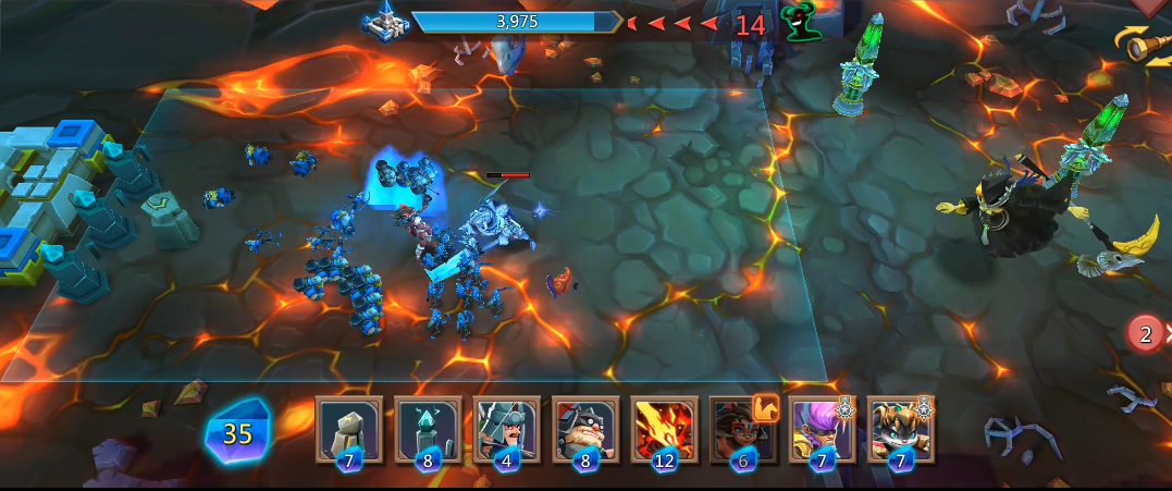 战斗开始后第一时间在前排放置大斧头兵,他的高坦度能有效阻挡敌方推进。同时在后排放置图腾和夜星,利用他们的超远射程进行风筝输出。魔法技能不要急着放,等敌方单位聚集较多时再使用箭雨和大地崩裂,这样能最大化技能效果。如果兵线推不进去,直接用技能消耗敌方水晶也是可行的。