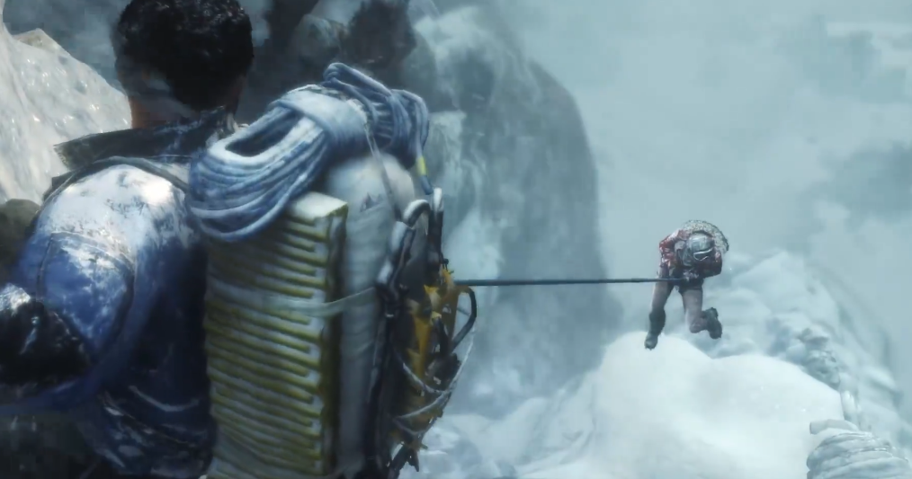 刚开始雪山这段剧情时,咱们会跟着队友沿着小路前进,走到一半突然遇到山体滑坡,这时候一定要快速反应。屏幕上会出现小手图标,记得立刻按E键用登山斧钩住冰壁,不然就会掉下去。钩住之后别急着往上爬,先往右边移动,按住方向键不松手,到断裂处按空格键跳跃,跳过去后还得再按E键抓稳。这里操作要连贯,稍微慢一点就可能失败。