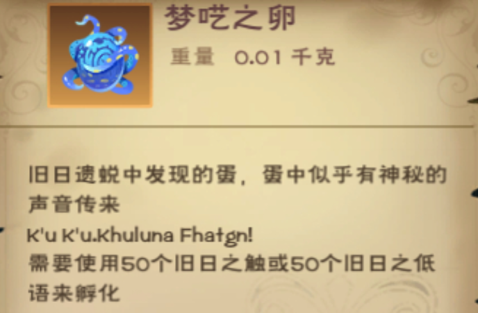 梦呓之卵可是好东西,能孵化出库露娜,不管是当宠物还是坐骑都很拉风。孵化的时候要注意,如果想让它变成战宠,就得准备50个旧日之触;要是想让它变成三栖坐骑,就得用50个旧日之低语。旧日之触和旧日之低语也能通过打章鱼boss或者开礼盒拿到,所以刷章鱼的时候记得多攒点材料,免得后面不够用。