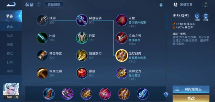 提供高额的百分比物穿和暴击率,打坦克必备,通常第四件或第五件出。如果对面法师比较厉害,你可以考虑出个魔女斗篷增加魔抗。最后一件保命装很重要,贤者的庇护(复活甲)或者名刀·司命都是好选择,让你在团战里有更多操作空间。也有人会出破军来进一步提升收割能力,但那样会更脆,需要更好的站位和意识。出装不是死的,关键是理解每件装备能给敖隐带来什么,比如需要更频繁放技能就堆冷却,对面肉多就早点出破晓。