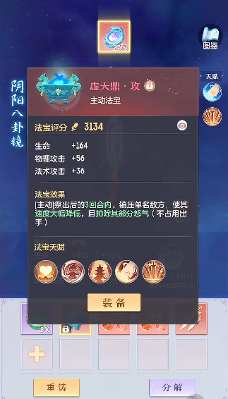 但它强大的法术输出能力让它成为挺不错的搭配选项。火莲灯的主动技能在回合末能造成额外法伤,尤其适合多段法术攻击的职业使用,结合八卦阴阳镜的效果,能打出固定伤害加火莲状态叠加,进一步提升输出。法宝升级后会获得启灵点,这些点可以用来学习被动技能,对于龙宫来说,龙灵和法术连击都是热门选择,前者确保命中率和伤害提升,后者则提供额外的法术连击几率,虽然概率不高,但一旦触发就能多打一轮,收益很明显。前期材料比较紧张,建议先专注升级法宝,别急着重铸,等资源充足了再调整。 玄机伞作为防御型法宝,能有效减免受到的伤害,避免龙宫还没出手就被击败的情况发生。