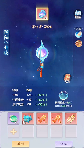 八卦阴阳镜这个法宝特别适合龙宫,因为它属于被动类型,每次出手前被攻击一次,就会叠加一层法术伤害加成,最多能到三层,因为龙宫出手慢,常在回合末行动,很容易吃下多次攻击,从而快速叠满被动,让接下来的法术爆发更猛。它的技能还能通过升级来强化,每升一级法术伤害加成会提高,还能学到像龙灵这样的被动技能,让技能无视闪避还能提升伤害比例,简直是量身定做。