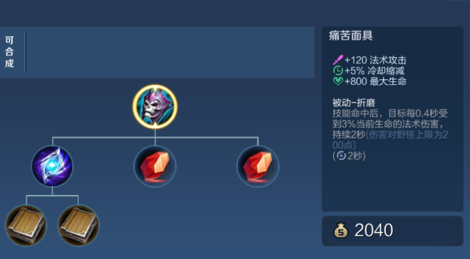 等到游戏进入中期,装备格子富裕一点了,痛苦面具也是一个不错的兼顾伤害与冷却缩减的选择。它除了能造成百分比伤害对付坦克比较有效之外,本身也带有5%的冷却缩减属性。虽然看上去不多,但它是和你已经有的冷静之靴以及圣杯的效果叠加的,这样你的减CD属性就会越来越高,越来越接近40%的上限。这个时候你的技能基本上已经转得很快了,可以更多地利用技能组合去打消耗和限制,而不是总在等技能冷却。