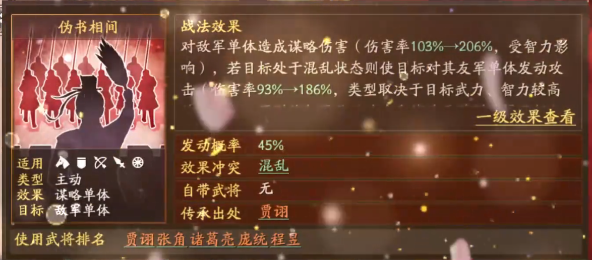 部分事件战法和传承战法同样具备混乱效果,例如挟势弄权和伪书相间。这些战法通常需要特定武将兑换,但效果较为强力,适合搭配高速度武将使用,以优先触发混乱打乱敌方节奏。混乱战法的实际效果与武将属性无关,因此即使白板武将也能发挥较大作用,适合平民玩家使用。混乱效果对部分依赖普攻的阵容克制明显,例如突击队或连击流派。