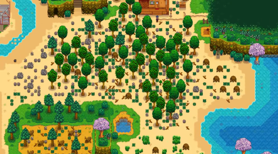 森林农场特色在于资源采集,每日刷新8个硬木桩和季节性觅食物品(如春季的羊肚菌、秋季的蘑菇)。耕地面积较小(1413格),但硬木和采集物能快速补充初期资源,适合注重手工和觅食技能的玩家。西侧的池塘可钓到木跃鱼,但垃圾率约50%。
