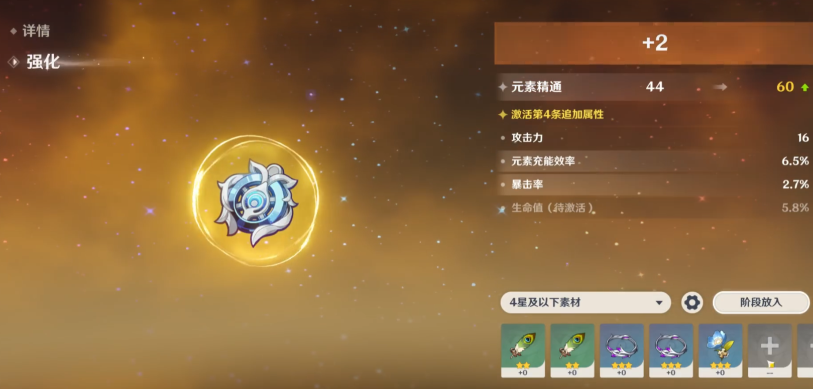 先用低品质圣遗物垫刀,比如三词条单爆的胚子,如果第四条出双暴就赚了,没出也不心疼。强化过程中如果出现双倍经验,建议停手,因为后续容易歪属性。优先拉满主属性正确的圣遗物,尤其是花和羽这类固定主词条的部位。沙漏、杯子和头冠的主属性选择更灵活,但也要确保符合角色定位。