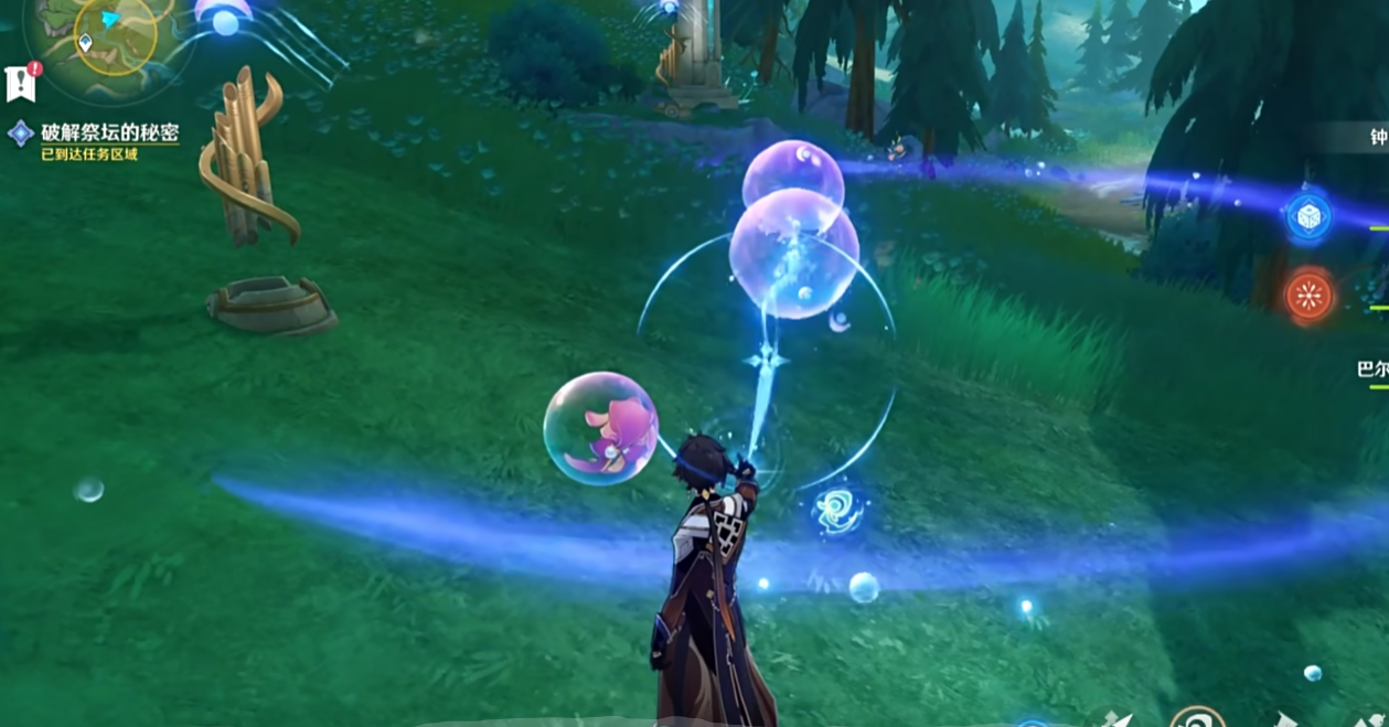 祭坛解密过程中需注意环境交互机制。部分祭坛区域存在菌毯障碍,需吸收章鱼力量发射光束清除。解密核心在于利用水泡激活簧管,按簧管符文数量依次触发。具体操作时,先用E技能将水泡推至指定位置,确保光圈边缘覆盖簧管范围,再使用AOE技能同时击破水泡实现同步激活。西北方向祭坛需优先击败水史莱姆,东南方向则需处理双菌毯后再调整水泡位置。