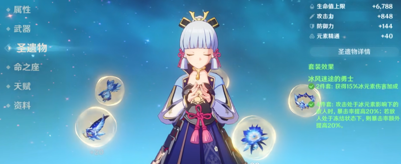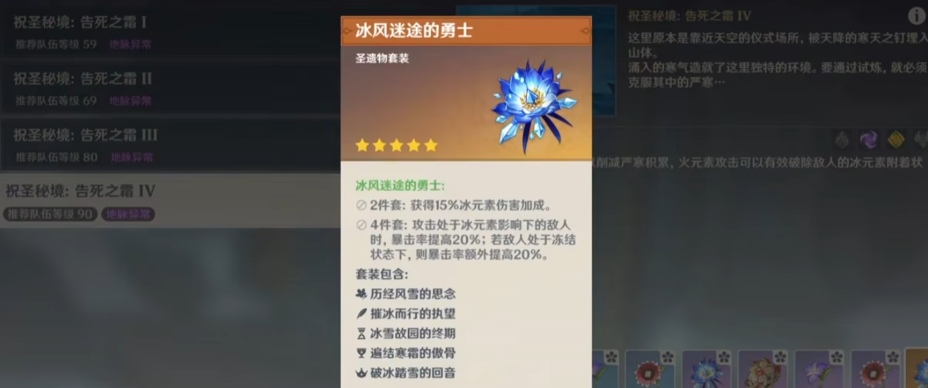 冰风迷途的勇士套装效果非常契合永冻队玩法。两件套提供15%冰伤加成,四件套对冰元素影响下的敌人提升20%暴击率,冻结状态下再追加20%暴击。这意味着在神里绫华、甘雨等角色的永冻体系中,四件套能稳定提供40%暴击率加成,大幅降低暴击词条需求。注意四件套效果需要角色前台触发,后台角色无法享受暴击加成。
