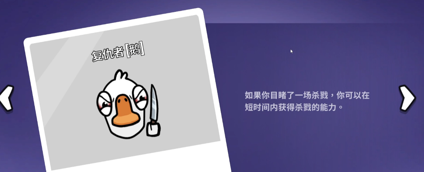 复仇者是鹅阵营中的特殊角色,咱们在目睹凶杀案后可以短暂获得一把刀,用来报仇雪恨。这个技能适合在关键时刻使用,比如看到队友被刀后迅速反击。玩复仇者时前期要正常做任务,观察周围玩家,尽量跟随有杀人动机的人,但不要一直跟着,避免被怀疑。如果成功拿到刀,可以直接击杀刚刚动手的人,不用管对方身份。复仇者需要明确目标再出手,避免误伤队友。