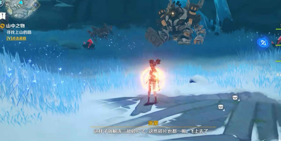 第一块碎片在覆雪之路的忍冬之树旁边,周围有四块深赤之石,打碎后记得快速攻击碎片。第二块在星荧洞窟最底层,需要先完成限时挑战解除屏障。第三块在眠龙谷的小祭坛,要跟着仙灵激活五个冰柱才能看到。每块碎片解冻后都会飞向山顶,这时候就可以准备下一步了。