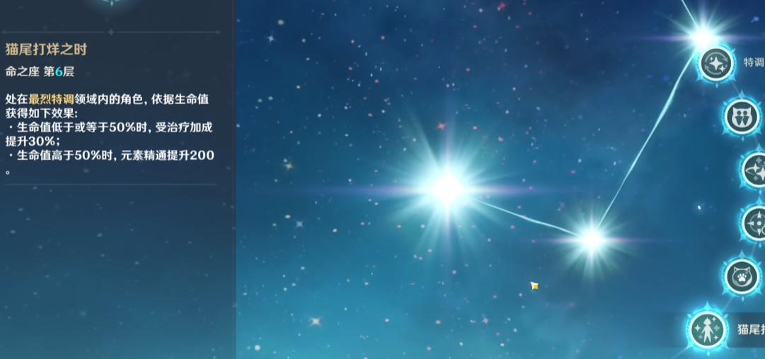 4命与5命属于常规数值提升型命座,前者缩短领域内蓄力时间但实战利用率较低,后者增加元素战技等级强化护盾厚度。6命实现功能性飞跃,领域内根据生命值比例提供200元素精通或30%治疗加成,对元素反应队有显著增益。该效果与砂糖、万叶等精通拐形成互补,但需注意领域范围与持续时间限制。非反应队伍中6命收益会相应降低。