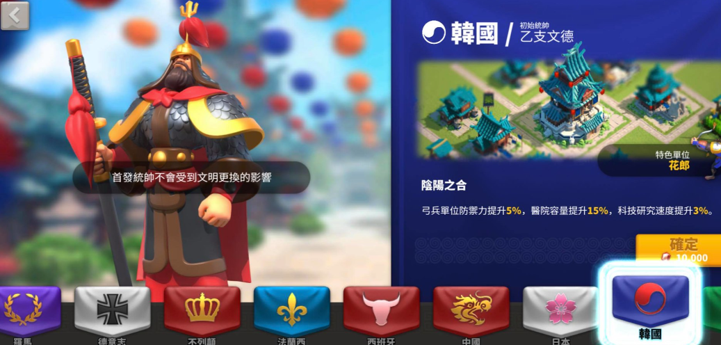 中期发展阶段推荐转向韩式文明,其3%科研加速和15%医院容量加成为科技型玩家提供显著优势。特色兵种花郎配合弓兵防御加成,适合中期资源采集与科技研发并重的策略。氪金玩家可优先选择该文明,通过研究速度优势快速解锁T4以上兵种,形成科技压制。