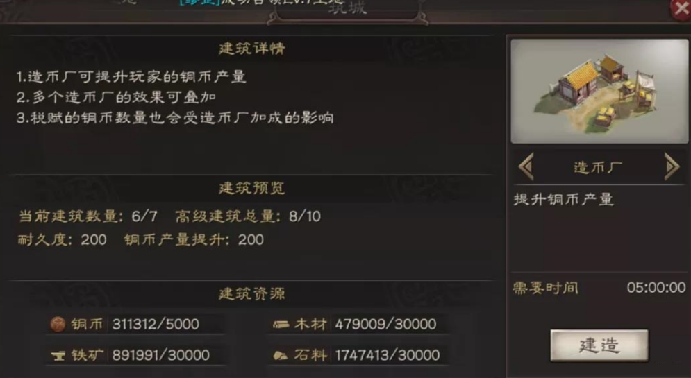 造币厂是提升铜币产量的核心建筑,其建造需满足特定条件。玩家需在六级资源地上进行建造,且名声值需达到6000才能解锁首个造币厂,此后每增加2000名声可多建造一个。建造后,原土地的势力值将被清除,转而获得造币厂提供的势力值加成,初始为200点,随等级提升逐步增加。