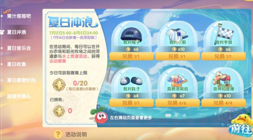 装备好冲浪板后,接下来就是寻找适合冲浪的地方啦!浆果丛林的激流勇进区域是最热门的冲浪地点,阳光牧场和开心农场中间的河道也可以冲浪。靠近水域时,系统会自动提示你开始冲浪,点击确认就能享受水上驰骋的乐趣啦!如果是在夏日冲浪活动期间,还可以通过活动界面直接传送到指定水域,和小伙伴们一起比赛哦!