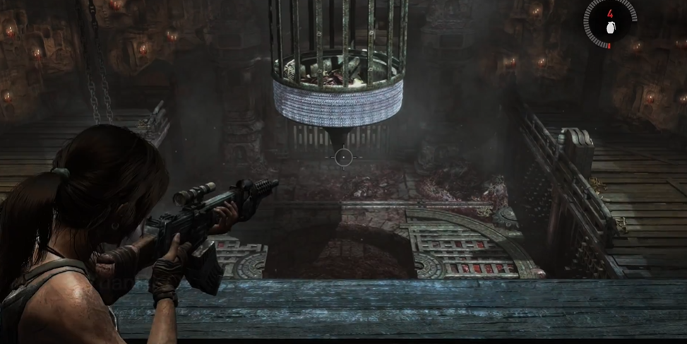 先走到控制杆旁边,用绳索箭射向铁锤,然后拉动控制杆让铁锤撞击木质平台。平台破裂后,立刻跳到对面开关处,这个开关能打开下层铁笼的门。这时候别犹豫,赶紧跳下去,再用绳索快速荡出铁笼范围。整个过程需要一气呵成,稍微慢一点就可能被火焰困住。