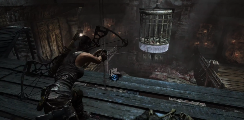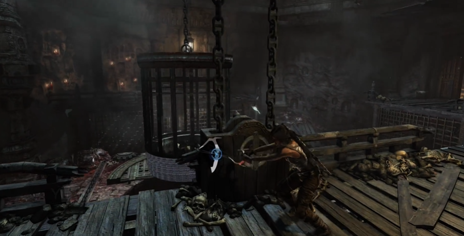 玩家需要利用环境中的机关和劳拉的技能完成一系列操作。首先拉动右侧二楼的铰链打开地井,再操作左侧二楼的铰链将铁笼拉出。随后返回左侧关闭地井盖,确保笼子能够稳定停留在指定位置。这一步骤的关键在于控制笼子的升降与地井盖的开合顺序,避免笼子卡住或无法移动。