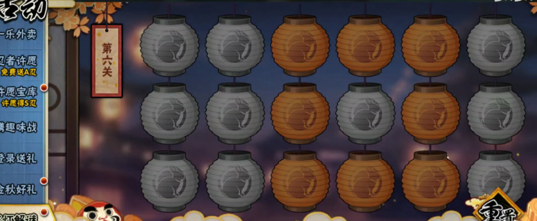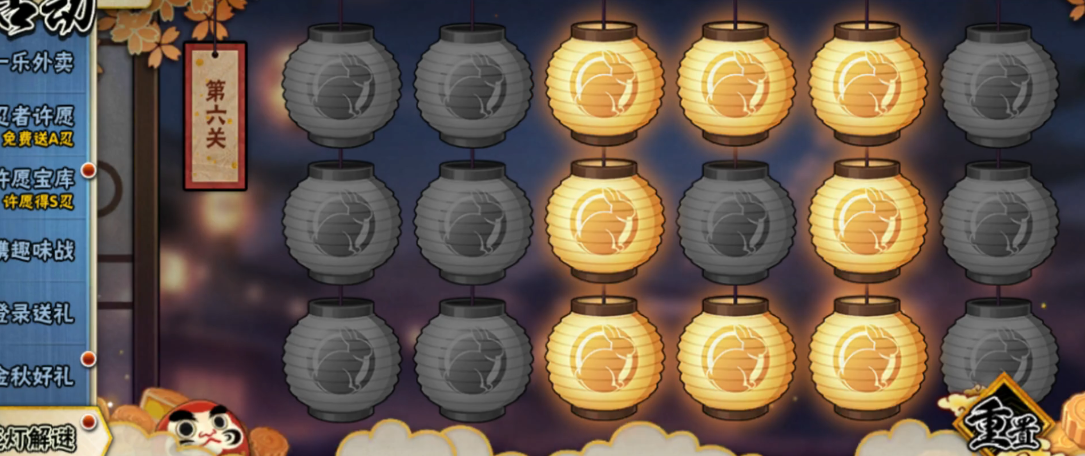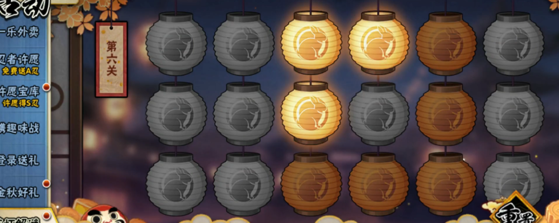 火影忍者手游花灯解谜第6关的通关关键在于点击图中标注为花灯1和花灯2的位置,这两个花灯的点击顺序没有严格要求。需关卡初始界面会有一个已经点亮的花灯,这个花灯可能会对玩家造成误导,但实际解谜过程中不需要理会它。点击操作会反转目标花灯及其相邻上下左右花灯的状态,最终需要确保所有花灯都被点亮才能完成挑战。