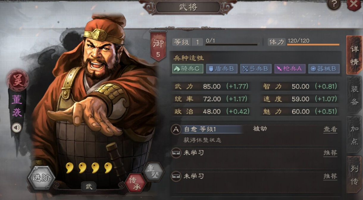 董袭在游戏前期的过渡作用不可忽视。其获取难度较低,培养成本适中,且技能机制简单直接,能够有效降低开荒阶段的战损压力。随着游戏进程推进,董袭可能逐渐被更高星级的武将替代,但其传承战法仍能长期服务于其他队伍。建议玩家根据自身资源分配和阵容规划,合理选择是否保留或拆解董袭,以最大化其战略价值。