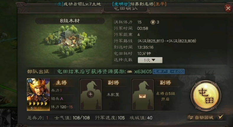 新手保护期是降低战损的最佳时机,48小时内武将体力消耗减半、占领土地时间缩短,且遗忘战法可全额返还战法点。应优先攻打高级资源地并快速练级,但需注意土地难度梯度。例如双武将8级可挑战3级地,13级尝试4级地,而5级地需20级且兵力超过6000。屯田功能开启后,优先选择石料等高需求资源,并尽量在等级最高的土地上执行以最大化收益。