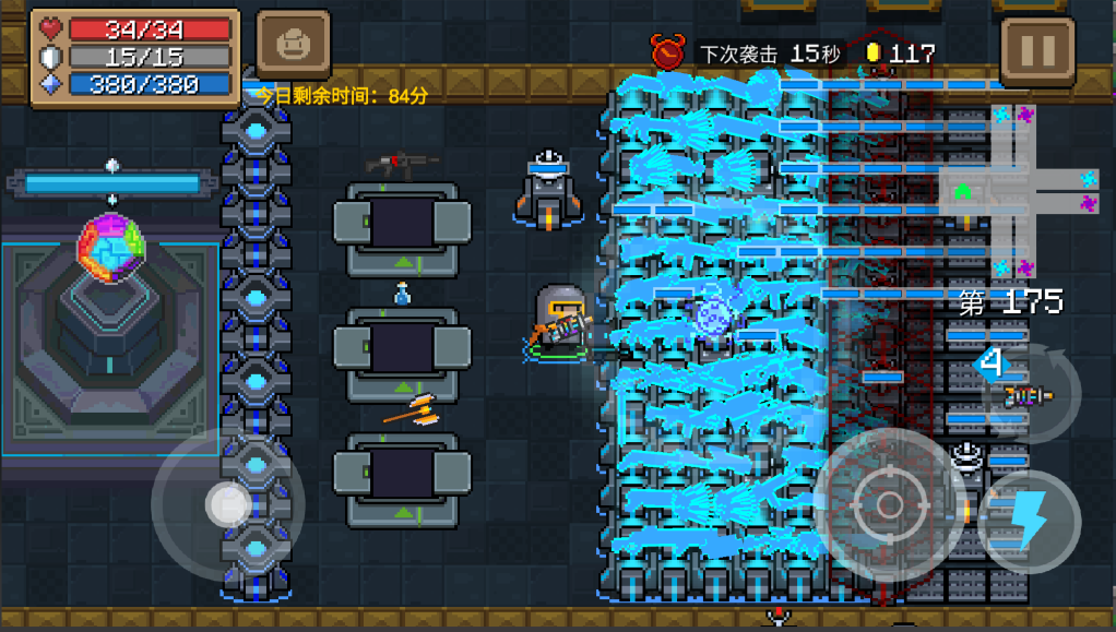 单兵作战的小伙伴可以试试彩虹加特林配精致法杖的组合。彩虹加特林在无限蓝量的无尽模式里简直就是神器,超高射速搭配元素效果,清怪效率杠杠的。精致法杖则能提供稳定的防护,抵挡大量弹幕。记得在场地后方布置20个左右的能量装置,解决打boss时蓝量不足的问题。这个搭配对走位要求不高,适合想要轻松游戏的朋友。