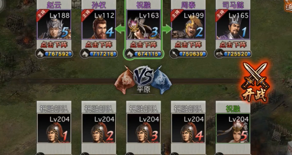 打祝融的核心思路是利用地形加成和技能克制。平原环境下推荐带司马懿反制混乱效果,孙权凭借吸血功能能稳定消耗敌方兵力。甘宁需要靠运气触发战法克制,周泰最好配备喷火车和红甲减少破甲概率。注意祝融副本的NPC都携带战车和特殊阵法,前四个部将特性相同但主将会有变化。
