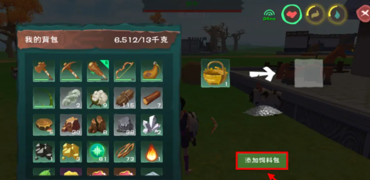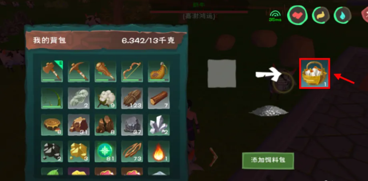 有了篮子之后,可以靠近已经驯养的家禽或畜牧动物,比如奶牛、鸡等,点击生产按钮。这时候会弹出界面,把篮子放入生产栏中,同时添加对应的饲料包。饲料包可以通过工作台加工获得,比如小麦饲料包就是用小麦制作的。添加足够的饲料后,等待一段时间就能收获产物了。