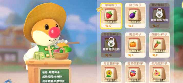 植物获取主要通过种植系统实现,玩家需从NPC梅森的种子商店购买种子,并在家园中开垦土地进行种植。不同植物的种子解锁条件各异,部分需要达到特定农场主等级或完成相关任务才能购买。萤火草种子需农场主等级达到25级后解锁,而蒲兰花种子则可在梅森的花园商店直接购买。种子售卖机、好友家园特产采摘也是补充植物来源的途径。