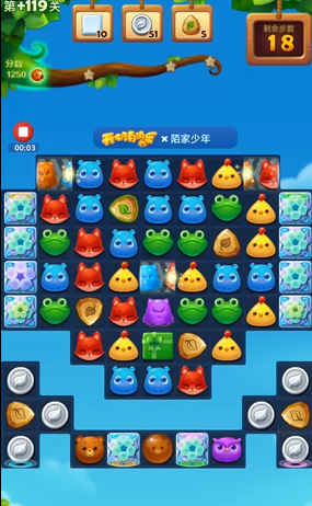 要特别注意豌豆的掉落位置和星星收集机制。豌豆全部消除后,剩余的步数会转化成额外的星星,藤条上的星星达到四颗时就代表成功了。尽量多保留步数,不要过度追求连击或高分,因为本关的通关要求是1万分,如果时间耗尽就前功尽弃了。避免同时消除多个炸弹,这样容易触发连锁失败,建议分批次处理。优先消除靠近底部的方块,这样可以引发更多的连锁反应,帮助清理角落的残余障碍。