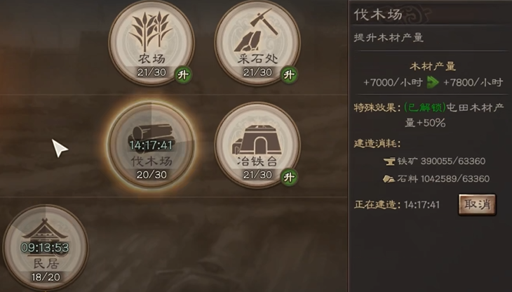 提升木料和石料产量的另一个关键点是升级城建设施。主城和分城里的伐木场和采石处是专门生产这些资源的建筑,它们的等级直接影响每小时产量。当这些建筑升到满级时,单座建筑每小时就能提供15000单位的资源,这相当于十几个五级资源地的总产量。建议优先将伐木场和采石处升到10级,这样可以解锁委任官职功能,进一步提升效率。
