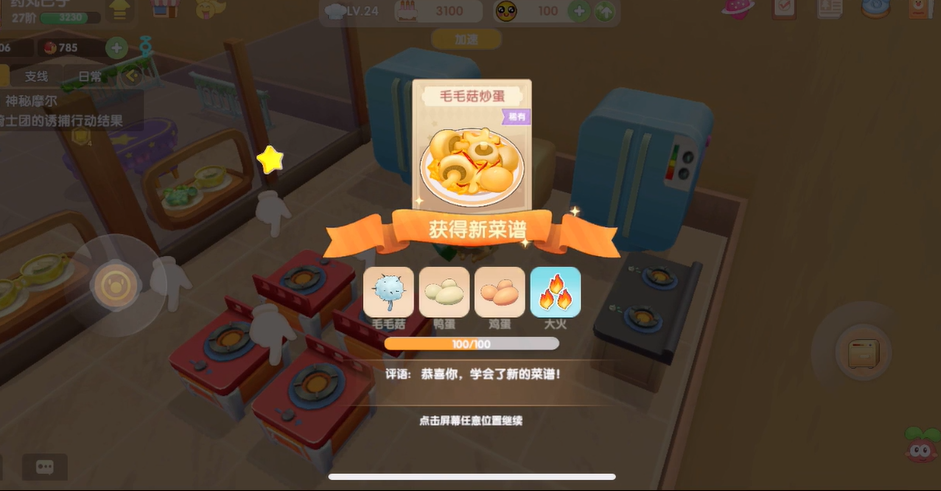 解锁毛毛菇炒蛋的食谱需要通过研究菜谱功能完成,玩家在厨房界面选择研究选项并准确投入食材。所需材料包括毛毛菇三个、鸡蛋三个和鸭蛋两个,投入后选择大火火候进行烹饪,大火能提升约78%的成功率,通常研究两次即可解锁菜谱。烹饪过程耗时约30秒,保温时间为两分三十秒,玩家需及时收取成品。火候控制是关键因素,使用中火或小火可能降低效率。