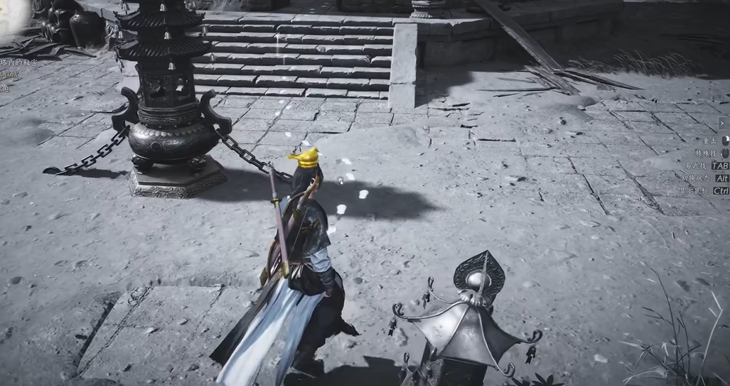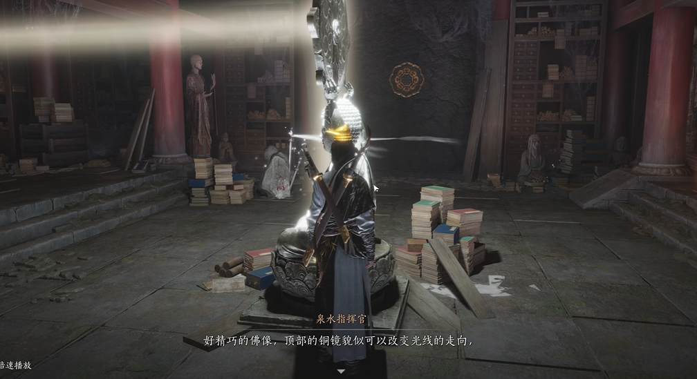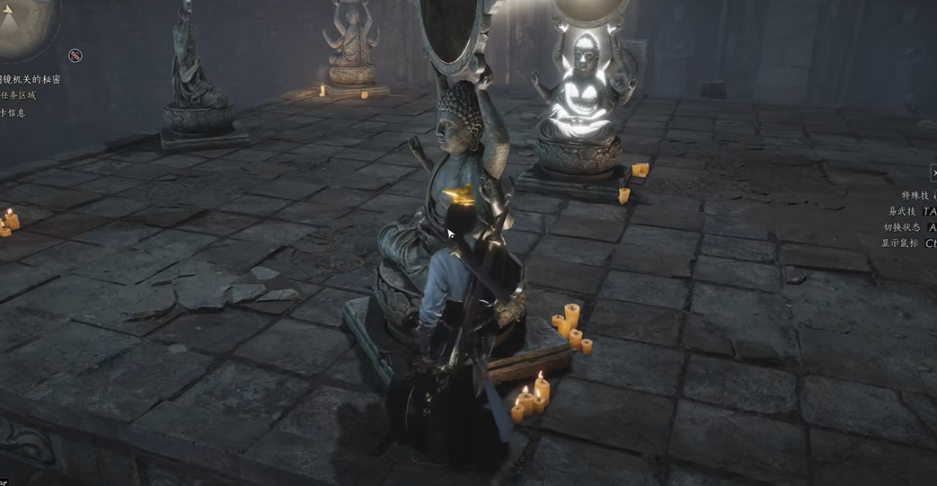 进入塔底后,使用听风辨问技能来探测隐藏的秘道,并运用金玉手能力控制佛像的旋转方向,使佛像镜光精确照射在石门上。这个环节需要玩家细心调整佛像角度,解决光线反射的谜题,同时可能遇到机关人干扰,这时需要使用卸势技能来应对并清除障碍。