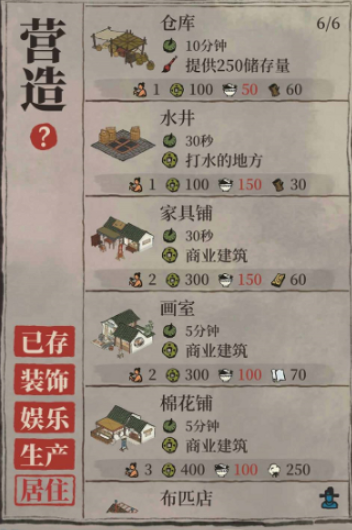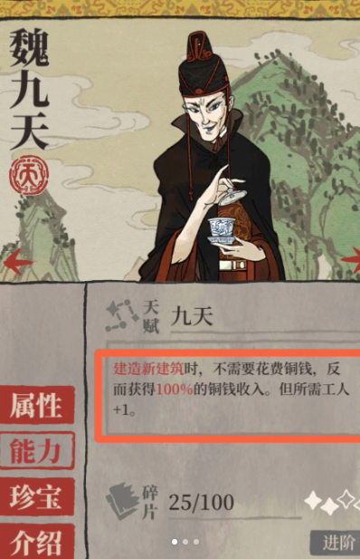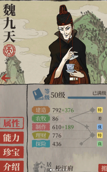魏九天作为一个特殊角色,能够帮助玩家高效地积累游戏资源。玩家只需进入营造界面,选择居住类建筑中的家具铺,利用魏九天进行建造,整个过程仅耗时三十秒。建造完成后,不仅获得一个家具铺建筑,还会自动上交300铜钱和69经验值。以六个四级仓库为前提,一次性最多可建造24个家具铺,总计获得7200铜钱和1656经验,这使得魏九天成为快速获取铜钱和经验的重要工具。