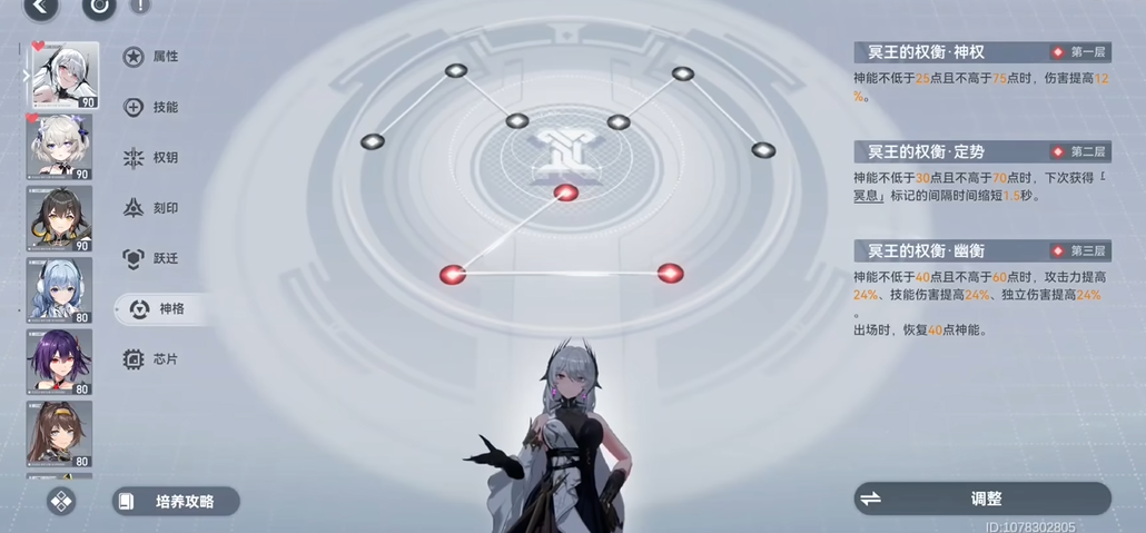 哈迪斯的技能机制围绕操控名为琉刻和明塔的两个人偶展开,其输出核心在于对神能资源的精密控制。她的普攻为远程,由两个人偶交替攻击,琉刻命中消耗神能,明塔命中则获得神能。一技能冥丝轮转用于切换操控的人偶,并为下次释放的二或三技能附加伴舞效果,改变技能形态。二技能和三技能是人偶的主要攻击手段,根据操控不同的人偶,会分别消耗或获得神能。当累积四个冥息标记后,长按普攻可进入共舞状态,此状态下暴击和暴伤大幅提升,能造成极高额伤害,但期间无法释放技能和获取标记。战斗的核心循环就是通过普攻和技能调整神能,积攒标记,并选择合适的时机开启共舞进行爆发。