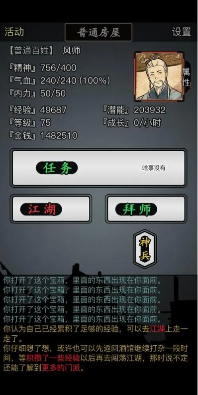 探索玄坛庙时需注意场景内无其他可交互NPC与隐藏宝箱,全部流程聚焦于薛归决斗,建议玩家在提升基础内功与拳脚武学等级后再前往挑战,降低操作难度。完成薛归相关任务后,可继续推进第五章落月山庄支线,与洛还君交互解锁拜师路径,两条支线互不冲突,可同步完成以高效获取潜能、阅历与武学秘籍,提升角色整体养成效率。