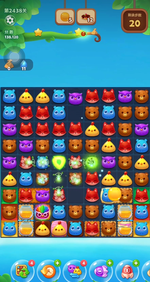 此关初始步数紧张,无法支撑常规消除,气球是破局关键,分布在关卡中上部与两侧,消除后能直接增加步数,为收集金豆荚争取操作空间。开局要优先聚焦气球周边,通过基础三消消除气球,不要浪费步数在随机移动的毛球上,毛球仅会小幅干扰消除路径,不影响金豆荚收集主线,消除气球时顺带清理周边普通动物,逐步打通金豆荚下落通道,同时留意动物排列,伺机合成直线特效,直线特效是收集金豆荚最高效的特效,能定向清除纵向或横向障碍,让金豆荚快速下落。