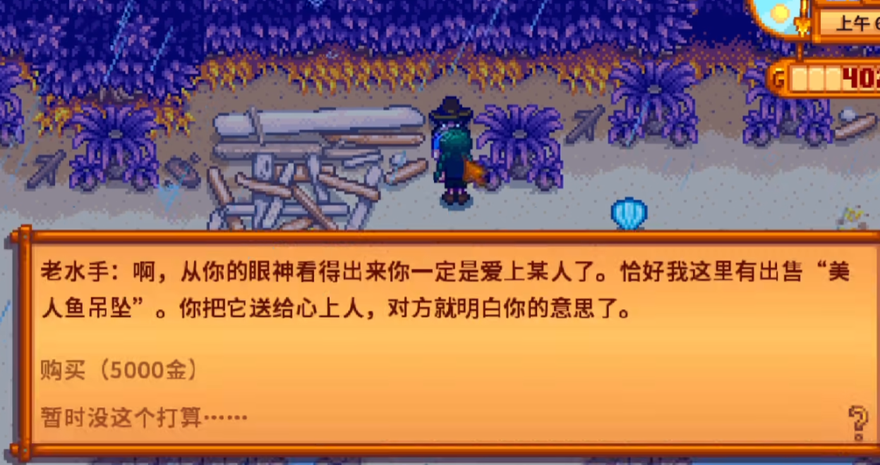 接下来要准备求婚的关键道具美人鱼吊坠。首先得攒够300个木材把海边断桥修好,这样才能在下雨天见到老水手。记住老水手只在春夏秋的雨天出现,冬天是见不到他的。见到老水手后花5000金买下美人鱼吊坠,不过要注意你的农舍必须至少升级过一次,否则他是不会卖给你的。买好吊坠后直接送给你心仪的对象,如果对方接受了,三天后就会举办婚礼。