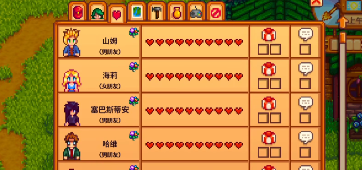 在星露谷物语里结婚关键是要先选好喜欢的村民,然后慢慢培养感情。你得先看看社交栏里哪些村民是单身状态,这样才能确定追求对象。当你们的关系达到8颗心后,就可以去皮埃尔的杂货店买花束送给他们了,这样就能解锁最后两颗心的好感度上限。
