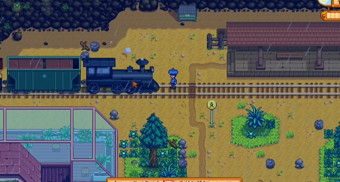 火车站的位置其实很好找,就在木匠家左边石梯上去的地方。一开始这里会被一块大石头堵住,需要等到第一年夏季第三日发生地震后,石头才会消失。地震是随机触发的剧情,不用着急,耐心等待就好。火车站开放后,每天的上午9点到下午6点之间,火车可能会经过这里,系统会提示一列火车正在驶过星露谷,这时候赶紧过去说不定能捡到好东西哦。