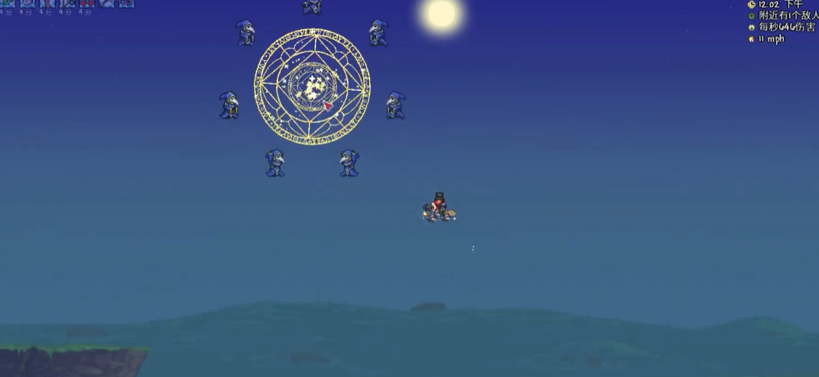 Boss会生成圆形符文和名为远古邪教徒的幻影假身,必须精准识别不发光的本体进行攻击。错误攻击假身会召唤幻影龙或远古幻影妖,大幅增加战斗难度。建议在仪式开始前调整站位,确保视野清晰。使用叶绿弹的自动追踪特性可辅助定位本体,同时注意保持平台间的机动路线畅通。击败Boss后会触发月亮事件,这是通往最终战斗的必要环节。
