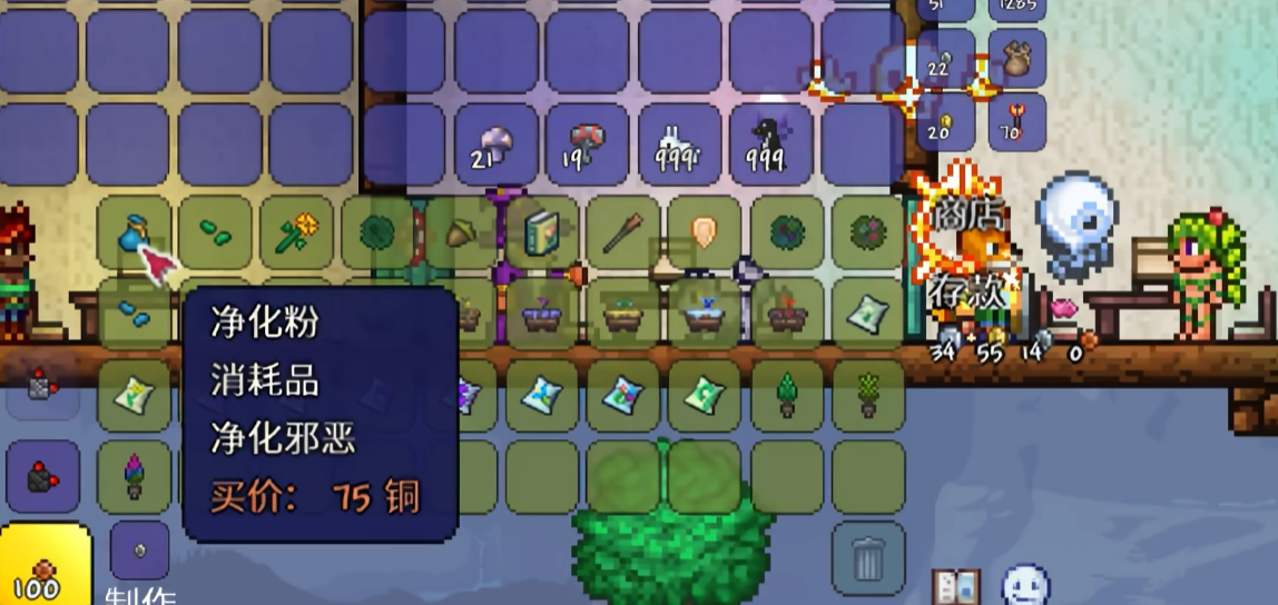 打完克苏鲁之眼、骷髅王这类初期BOSS后,树妖NPC就会入住你的世界。找她对话打开商店,花点小钱就能买到了。记得准备个空房间等她搬进来,不然她可不会出现。如果想批量净化,建议多囤点粉末,毕竟腐化和猩红蔓延起来可不是闹着玩的。