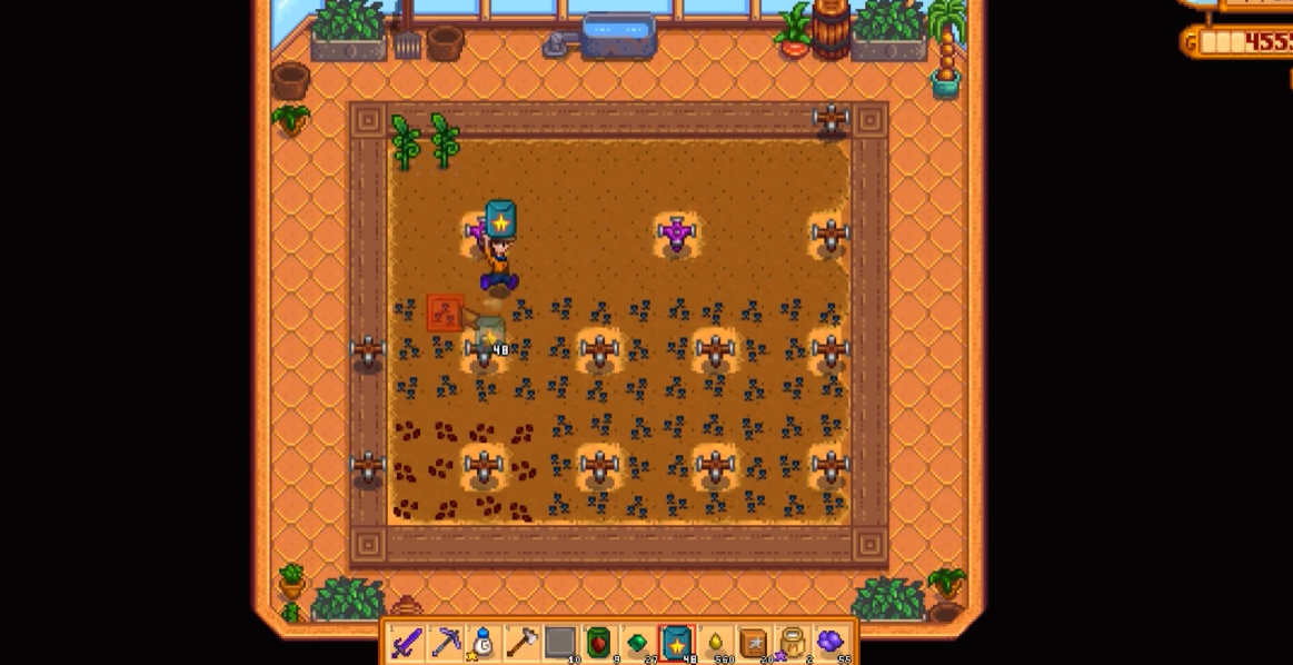 其生长周期为13天,但使用高级生长激素可缩短至9天,配合夏季的28天周期,理论上可实现单季三次收获(10日、19日、28日)。为确保高效种植,需提前规划洒水器布局并储备足量高级生长激素。换季时可通过种植廉价作物(如防风草)避免土地硬化,次日用镰刀清理枯萎作物后直接播种杨桃,此技巧能节省大量初期浇水时间。
