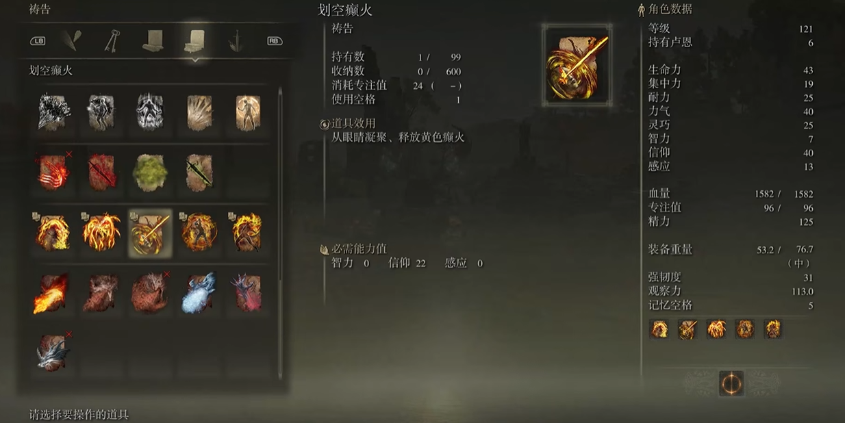 智信流的优势在于战术全面性,既有腐败吐息这样的持续伤害,又有夜与火的高爆发战技,还能用黑火球远程消耗。面对小怪可以用划空癫火远程狙击,王城区域特别好用。推图时先喷一口腐败,切换夜与火配合黑火球输出,基本能在蓝条耗完前解决战斗。左手建议配无战技盾牌,保持安全距离的同时还能补刀近战敌人。