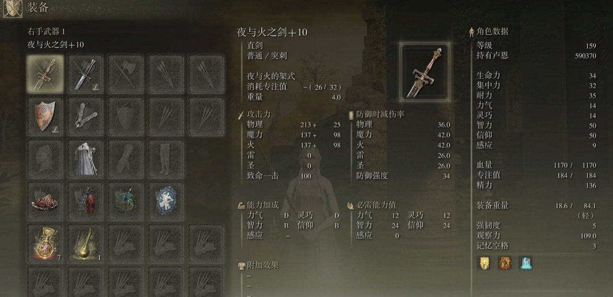 智信流是结合智力与信仰双属性的玩法,核心在于夜与火之剑和黄金律法圣印记的搭配。建议在击败满月女王后转型,前期开荒会比较吃力。加点方面优先保证血量35点,集中力25点,法力24点,感应12点,剩余全加信仰。这样91级就能基本成型,夜与火战技伤害爆炸,一炮能打一两千血,推图效率非常高。