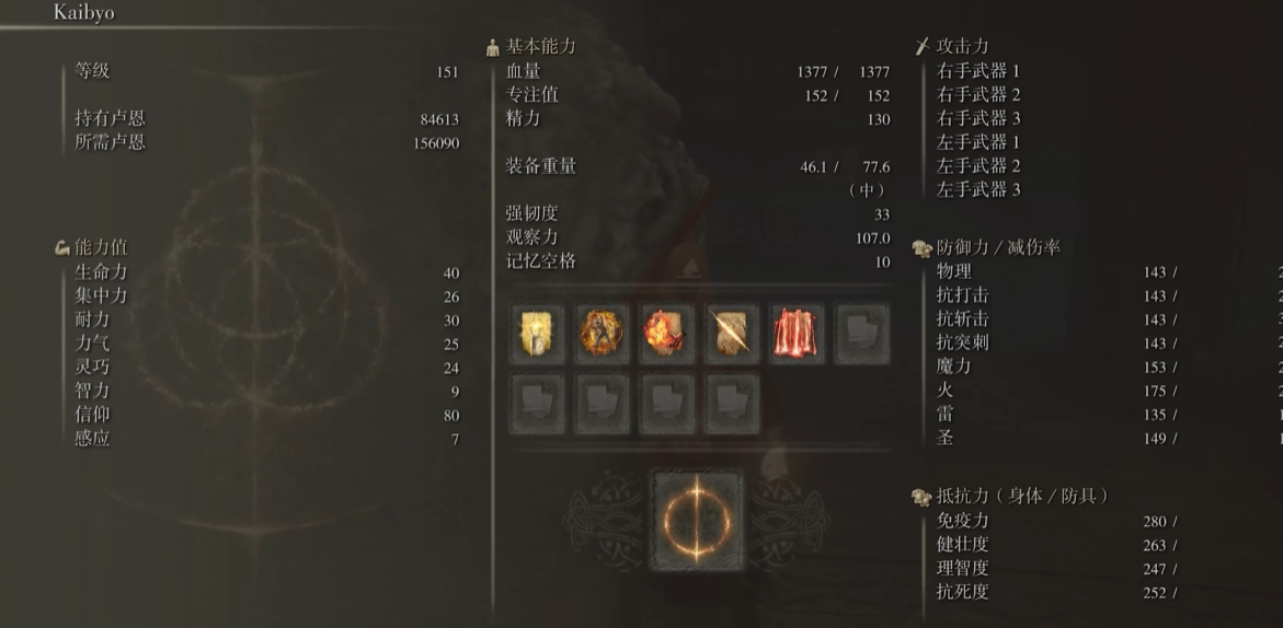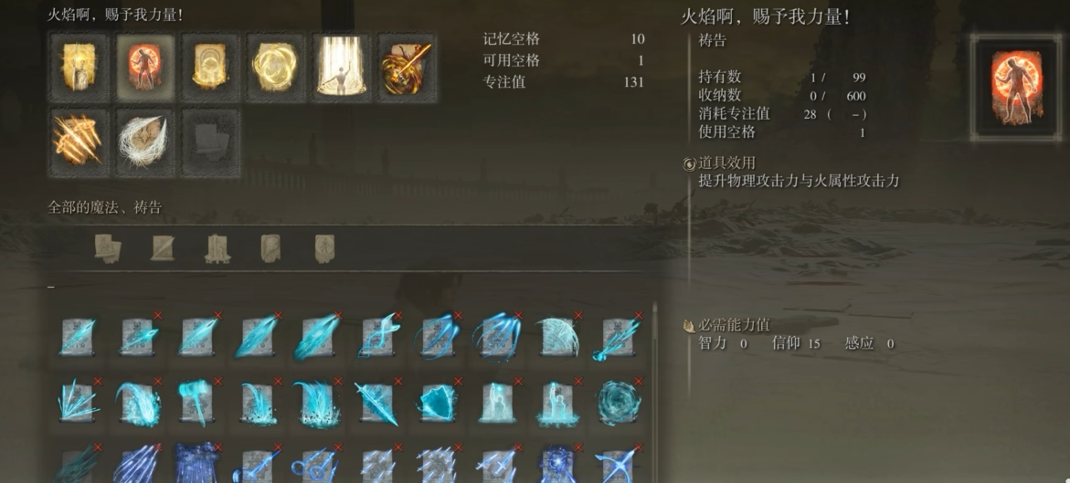 祷告火焰赐予我力量或黑焰庇护可提升物理输出或减伤,要求信仰15-25级;若使用亵渎圣剑等吸血武器,需将信仰补至50级强化战技效果。护符选择遵循场景需求:葛孚雷肖像强化蓄力攻击,龙徽大盾护符应对高伤害BOSS,绿龟护符优化精力恢复效率。