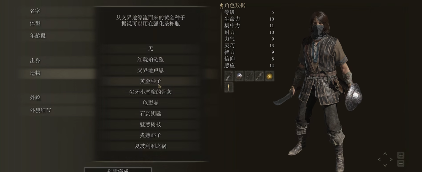 开局阶段建议选择黄金种子作为遗物,可额外增加一次圣杯瓶使用次数。防具方面初期可搭配旅行者套装,左手推荐装备100%物理防御的龟壳盾或鸢形盾,龟壳盾位于奥丽缇斯魔法师塔附近。魔法老师瑟濂位于驿站街遗迹的地下室,但初期自带辉石魔砾与辉石弯弧已足够应对大部分战斗,无需过早投资购买其他魔法。夜间返回艾雷教堂可触发拉妮支线,获取召魂铃与三狼骨灰,这是前期重要的召唤物支援。