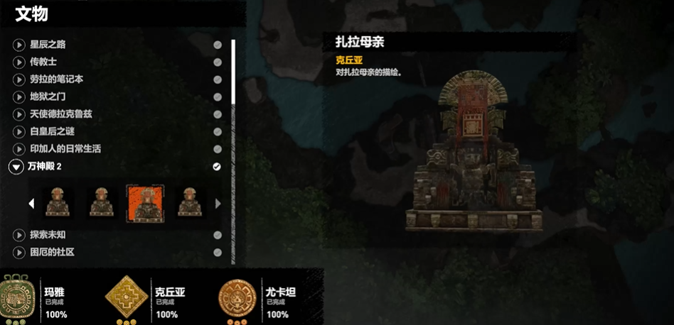 科祖梅尔区域的遗物收集相对简单,该区域共有14个收集品,其中包括壁画-巨蛇之心、求生贮藏点等。遗物-雕碗和遗物-陶瓷罐在该区域出现多次,需要仔细探索才能找全。库阿克雅库区域则有4件遗物,分别位于城市南部建筑、码头附近、城市北部以及南部洞穴中。这些遗物的位置较为隐蔽,部分需要完成特定解谜或使用攀爬技能才能到达。