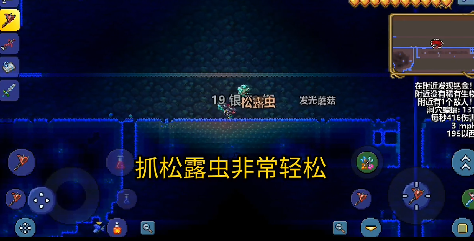 捕捉松露虫需要使用虫网道具,这是最基础且必要的工具。虫网可以从商人NPC处直接购买,购买后需将其放置在快捷道具栏中以方便快速使用。松露虫是一种稀有小动物,仅在困难模式下的地下蘑菇生物群落中生成,无法通过普通方式获取。它的刷新条件严格依赖于夜光蘑菇区域,且该区域必须位于地下,地表蘑菇生物群落不会出现松露虫。