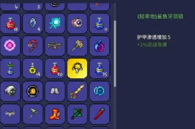 在保证基本生存后,可以开始有意识地搭配一些能提升远程作战能力的饰品。一个经典的前期搭配思路是注重机动力,例如组合鞋子、云朵瓶和疾风脚镯,这能让你在移动和闪避时更加灵活。可以搭配生命手环来加强生命回复,用脚镣提供额外的防御力。如果你在血月期间获得了鲨鱼牙项链,它对于前期射手来说是一个重要的伤害补充,尤其适合搭配像迷你鲨这类射速快的枪械使用,能有效提升对抗首领时的输出能力。