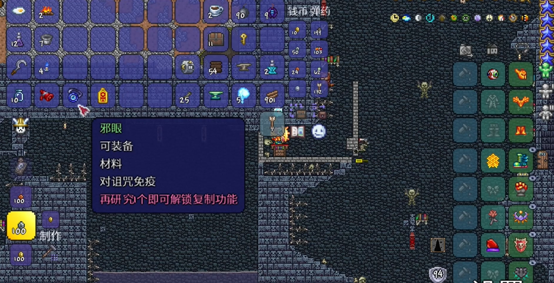 除了地牢的诅咒骷髅头,其他几种怪物也有机会掉落邪眼,但它们的生成条件更为苛刻或数量稀少。诅咒锤和猩红斧分别出现在腐化之地与猩红之地的地下环境中,附魔剑则生成于地下神圣之地,巨型诅咒骷髅头在地牢深处出现得也不算频繁。这些怪物的生成率普遍偏低,专门为了邪眼去寻找它们通常效率不高,远不如在地牢集中刷取诅咒骷髅头来得实在,因此它们更适合作为探索过程中的意外收获。